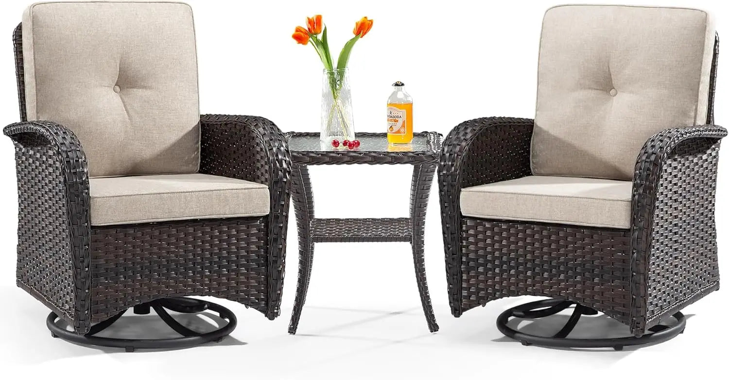 Transform your outdoor space with the Patio Swivel Glider Wicker Chairs - Outdoor Swivel Rocking Chairs Set of 2 with Wicker Side Table. Crafted for comfort, style, and durability, this elegant 3-piece set is perfect for creating a cozy and sophisticated patio oasis.